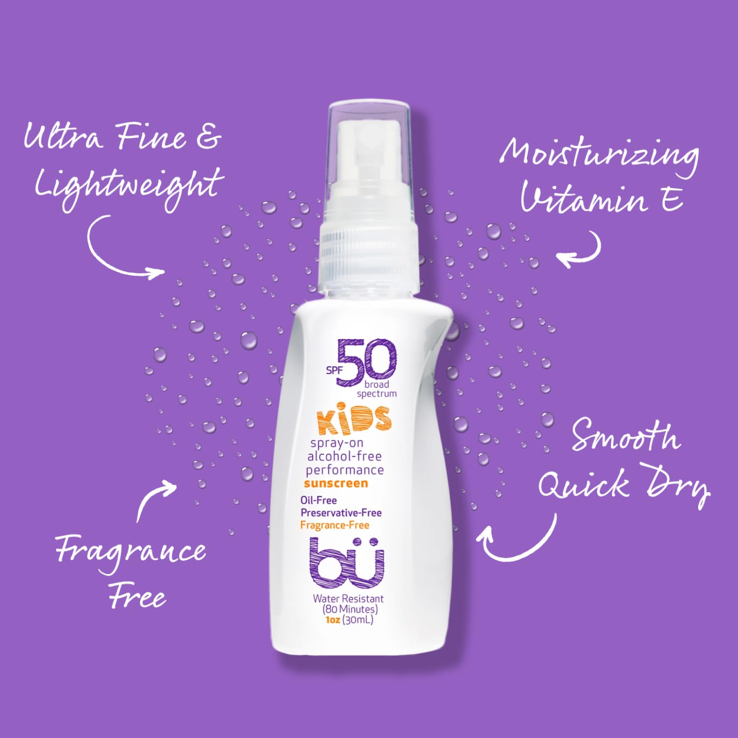 BU SPF 50 Fragrance Free Kids Sunscreen Spray for Face and Body, TSA Travel Size Sunscreen, Clear Non Aeorsol Spray, Non Greasy, Water Resistant and Oil Free, 1 oz (4-pack)
