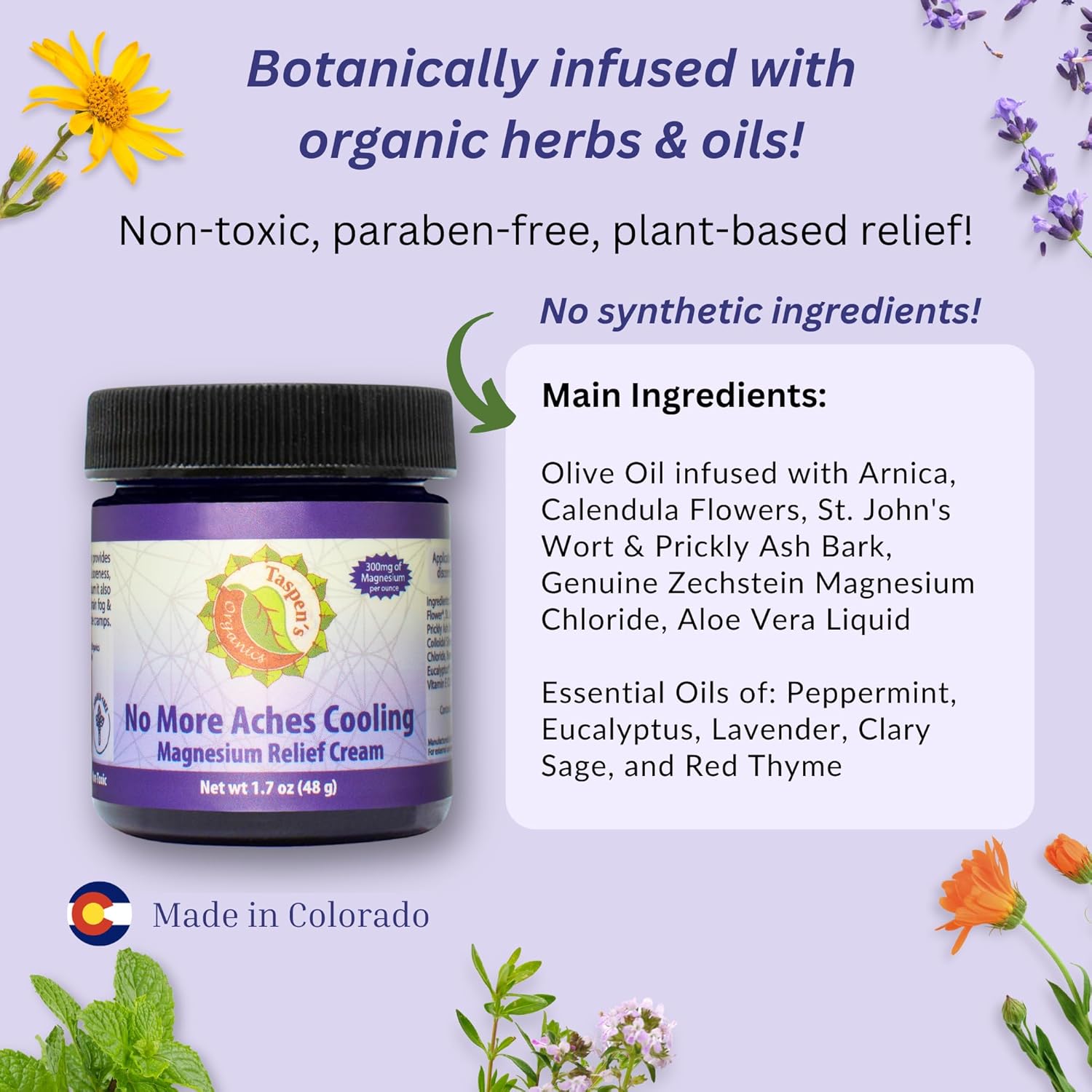 Taspen's Organics Magnesium No More Aches Cooling Cream - Muscle Relief- Sore Muscles & Post-Workout Recovery - Natural Comfort for Tension & Cramps - Made in USA (1.7 oz)