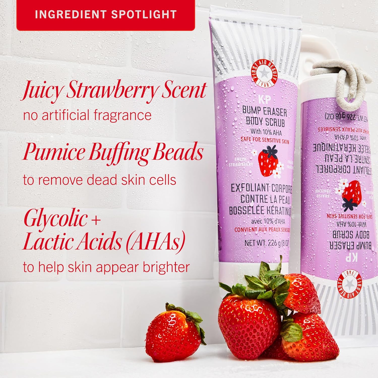 First Aid Beauty - KP Bump Eraser Body Scrub with 10% AHA, Keratosis Pilaris Exfoliator with Glycolic and Lactic acids, Helps Reduce Chicken Skin Bumps, Safe for Sensitive Skin, Strawberry Scent, 2 oz