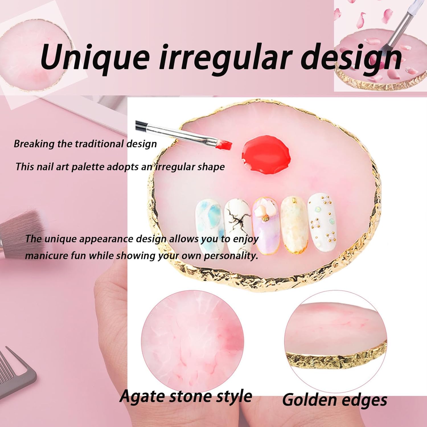 - đ ăEnvironmentally friendly and durable resin materialăThese nail art palettes are made of high-quality resin material, which is not only environmentally friendly and safe, but also sturdy and durable. Itâs also extremely easy to clean, with a simple wipe to restore cleanliness. The edges are sealed with smooth gold edges to effectively prevent scratches, making your use more comfortable and keeping your hands safe.