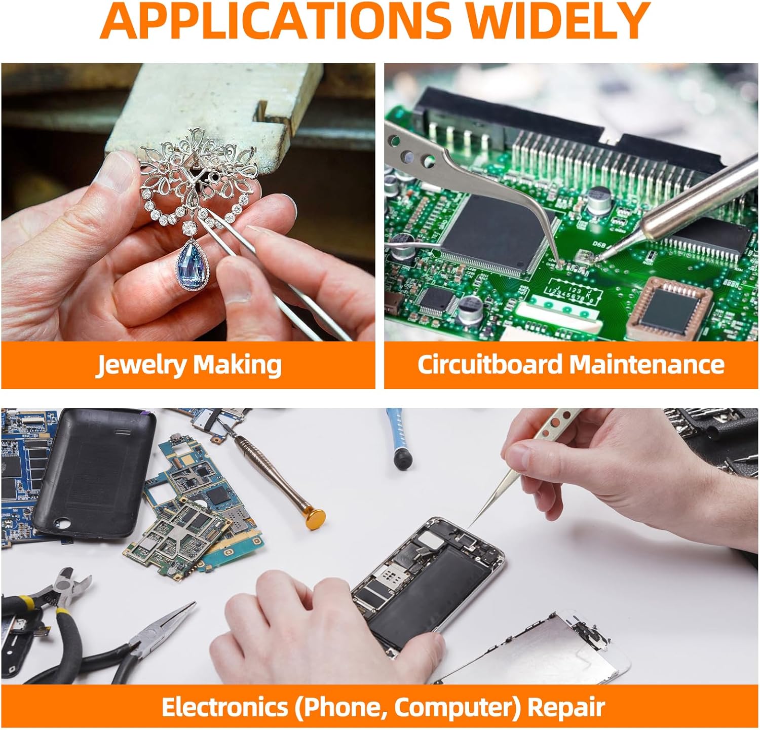 - ✔ FEITA multifunctional tweezers set has 5 types of tweezers, which suit for Electronics Repair, Craft, Jewelry, Soldering, Lab work, Model making, Stamp or coin collecting, Weeding vinyl design, Ingrown hair removal, Eyelash extension, Eyebrow removal, Paper Sculptures, Embroidery, Phone repair, Watch repair, Cameo, Diamond Painting, eyeglass, apparatus, etc.