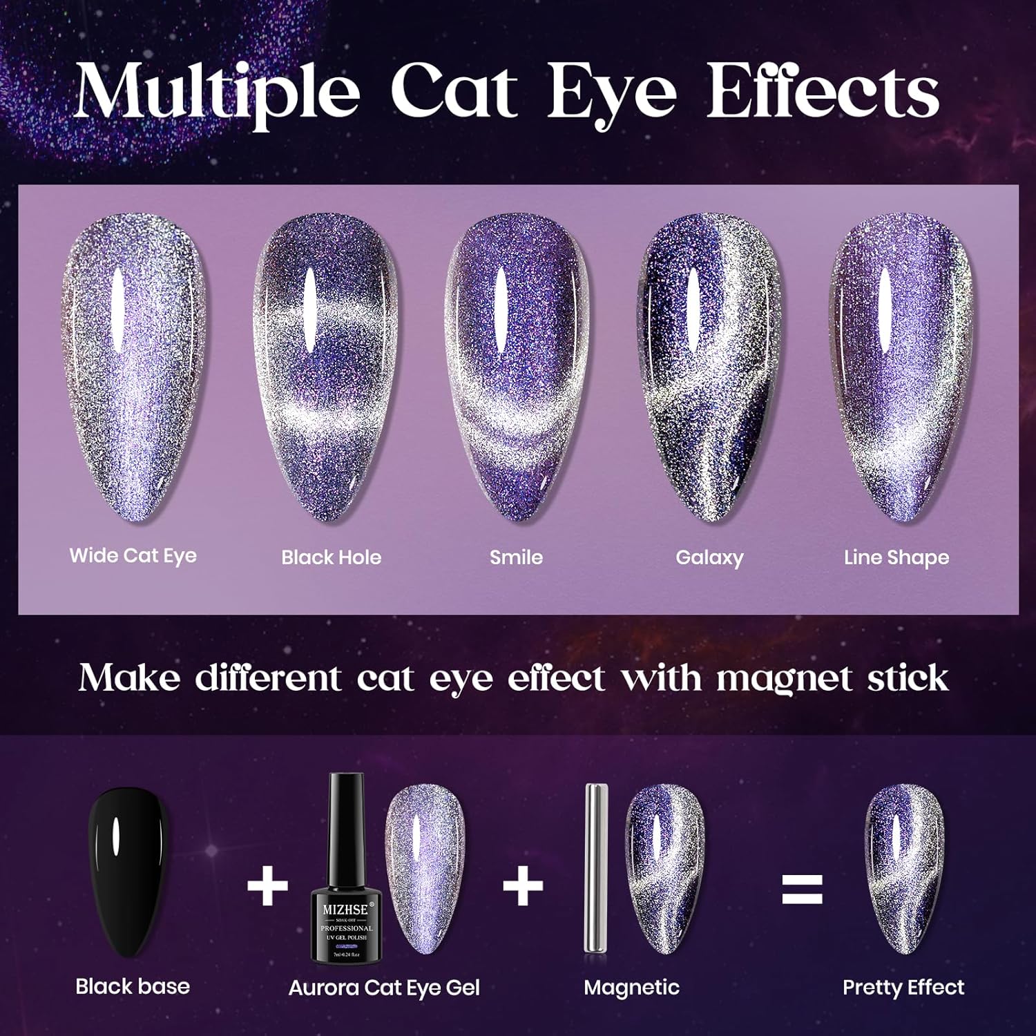MIZHSE Aurora Cat Eye Gel Nail Polish, 2 Colors Magnetic Gel Polish with Magnet, Holographic Shimmery Shiny Effect Soak Off Nail Art Manicure Home