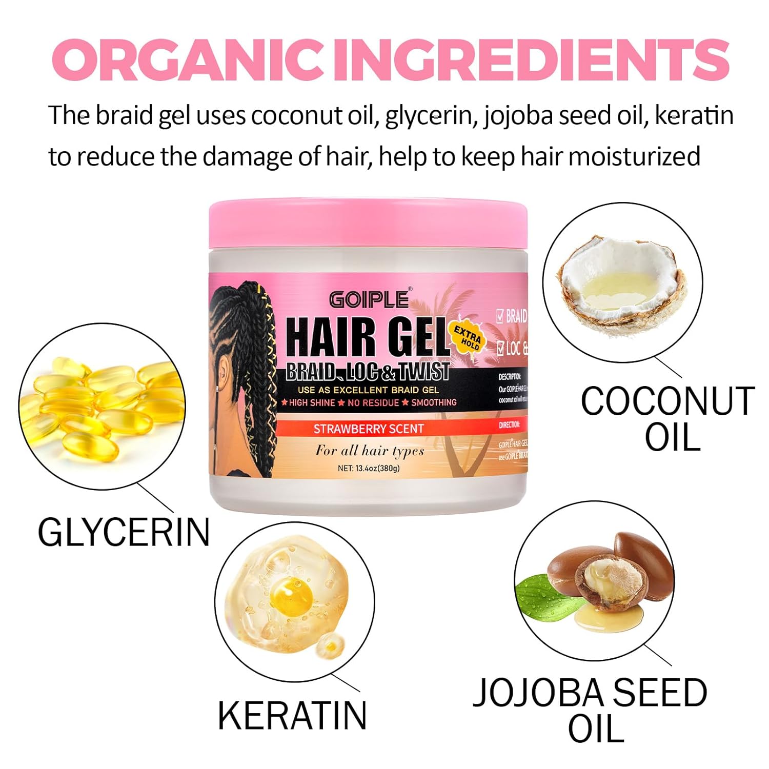 - Organic Ingredients: Our strawberry flavored braid gel for twist is made from natural ingredients such as argan oil, beeswax and coconut oil, which help us braid while nourishing the hair and making it look shiny