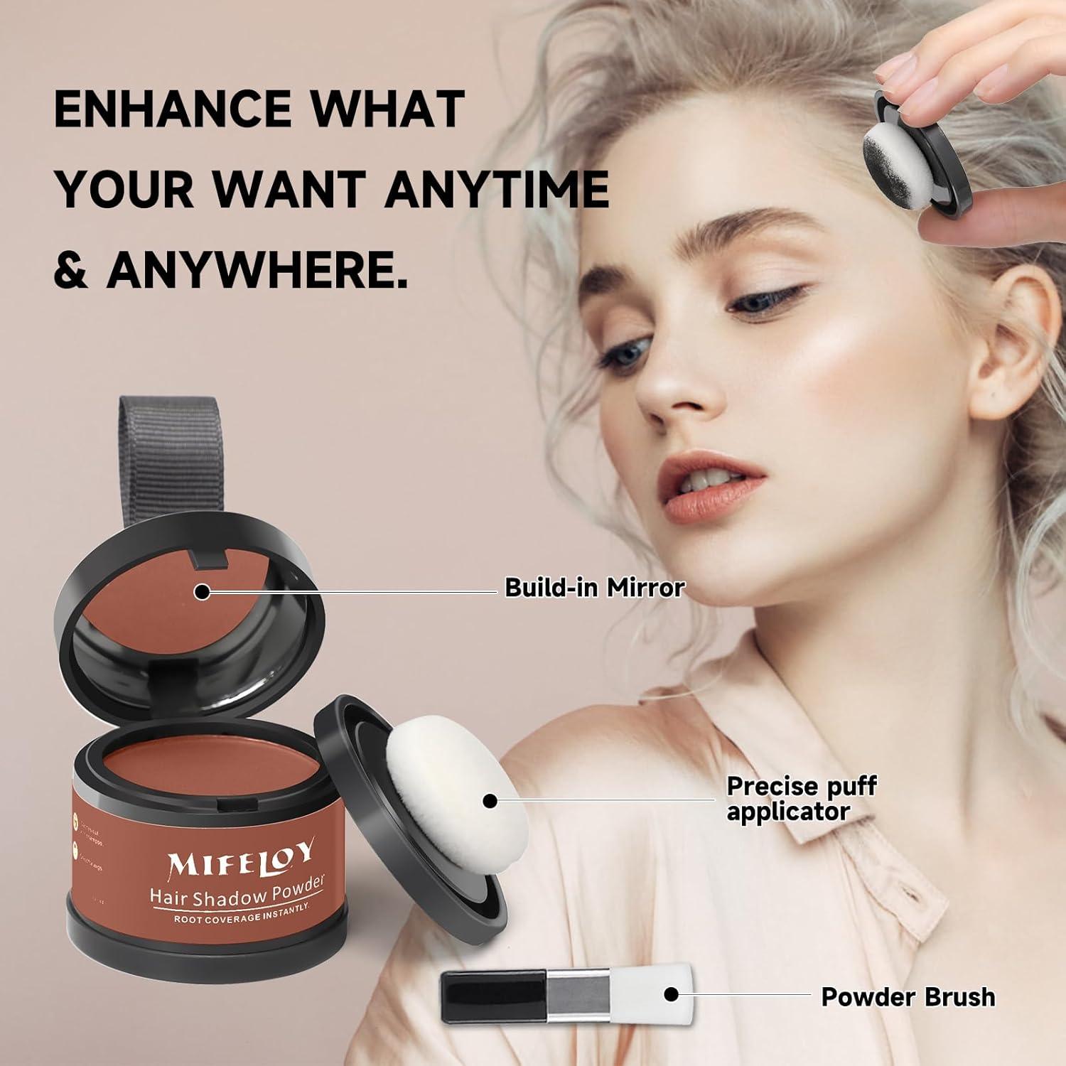 - How to Use - Mifeloy root touch up hair powder is easy to use. It only takes three steps to complete the modification of the hairstyle. The first step is to find the area that needs to be filled. The second step is to Simply remove the base powder puff, dab onto the applicator. The third step is to apply it along the hair texture for a natural and messy effect. For more precision, use your finger to lightly pat the powder.