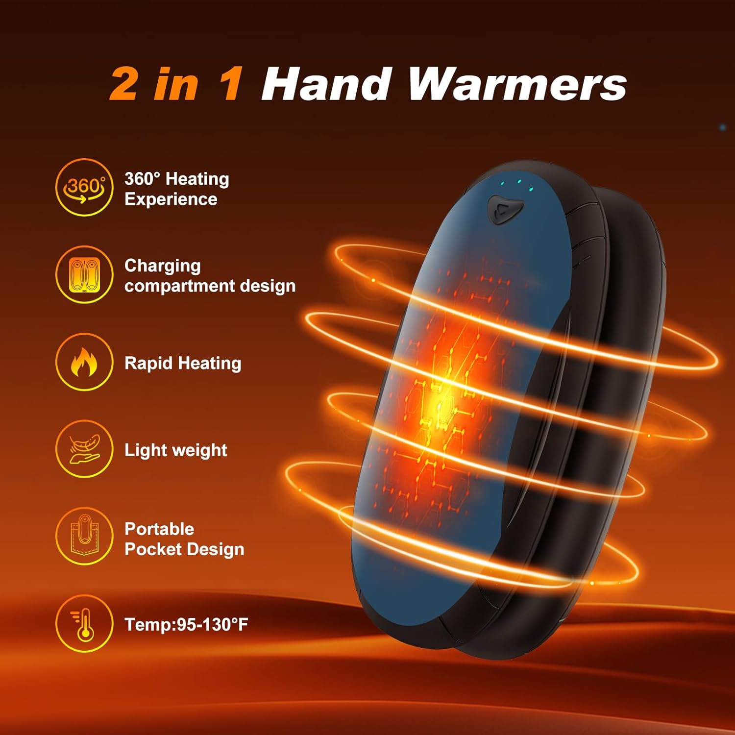 - 【2-in-1 Electric Hand Warmer】 - A set of 2 symmetrical hand warmers that can be combined into a palm-sized hand heater, providing 360-degree warmth for your hands. Alternatively, you can use them separately, each hand holding one, or share one hand warmers with a family. The portable pocket design is suitable for travel, hunting, golf, hiking, camping, skiing, and more