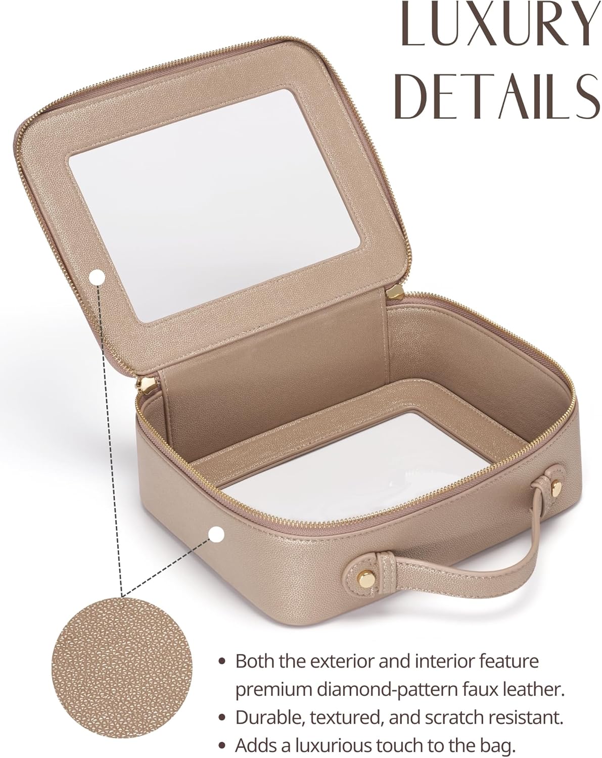 - [Premium Material and Durability] – The clear cosmetic case, both the exterior and interior, is crafted from high-grade diamond-pattern faux leather, which is highly scratch resistant, durable and exceptionally easy to keep clean. It features a smooth zipper for secure closure, and elegant light gold metal hardware accents, adding a luxurious and sophisticated touch to the bag's overall design.
