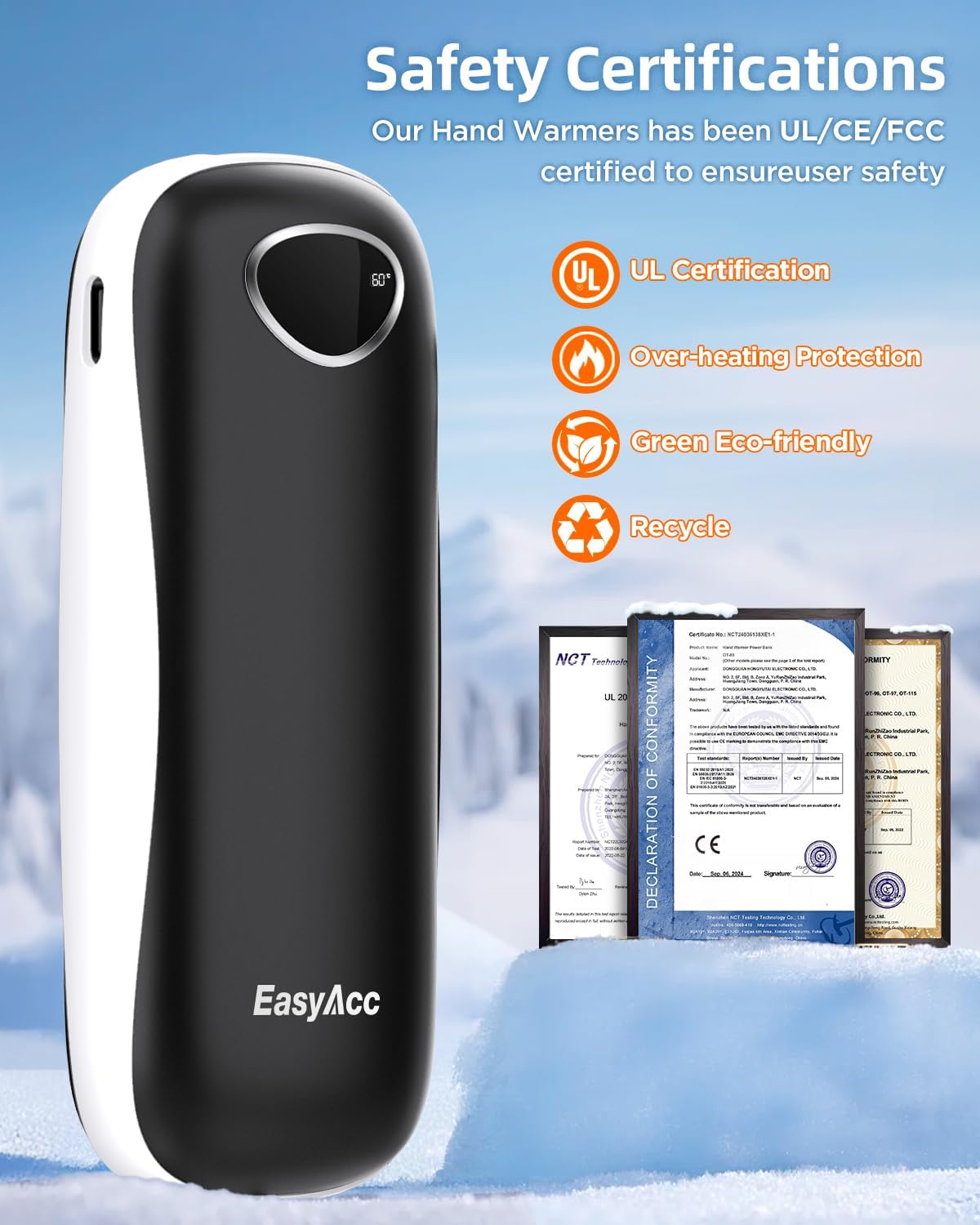 - 【The Palm-Friendly Design】: After 3 years of research, EasyAcc launched the most suitable hand warmers rechargeable for palm grip, perfect fit in the palm of your hand, Ergonomic design is comfortable to hold. The perfect winter companion for you and your Lovers!