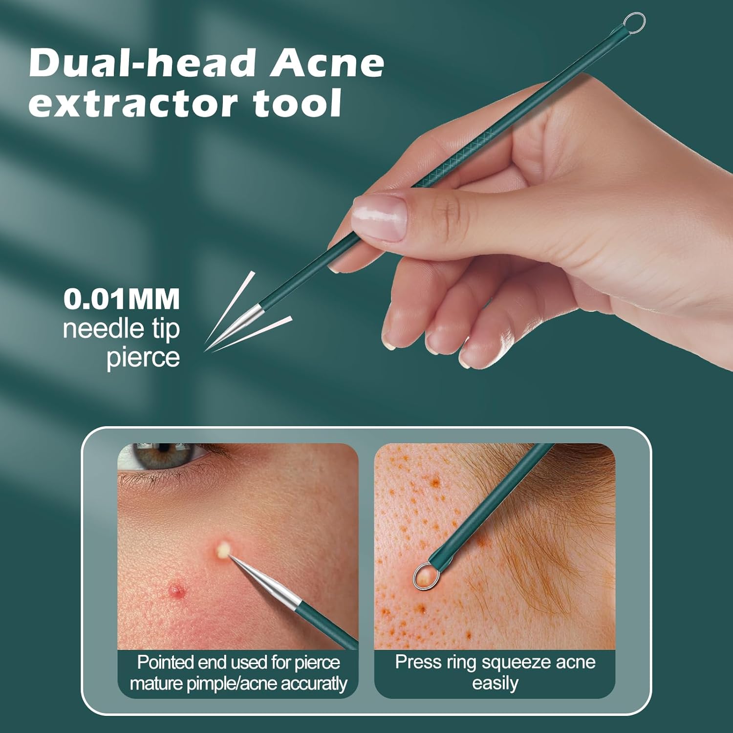 - Pimple Popper Tools with Needle and Pressing Loop: the sharp needle point help open the pore skin, the other loop can push and press to clean up every sizes of blackheads or blemish effectively, even the hard to reach area.