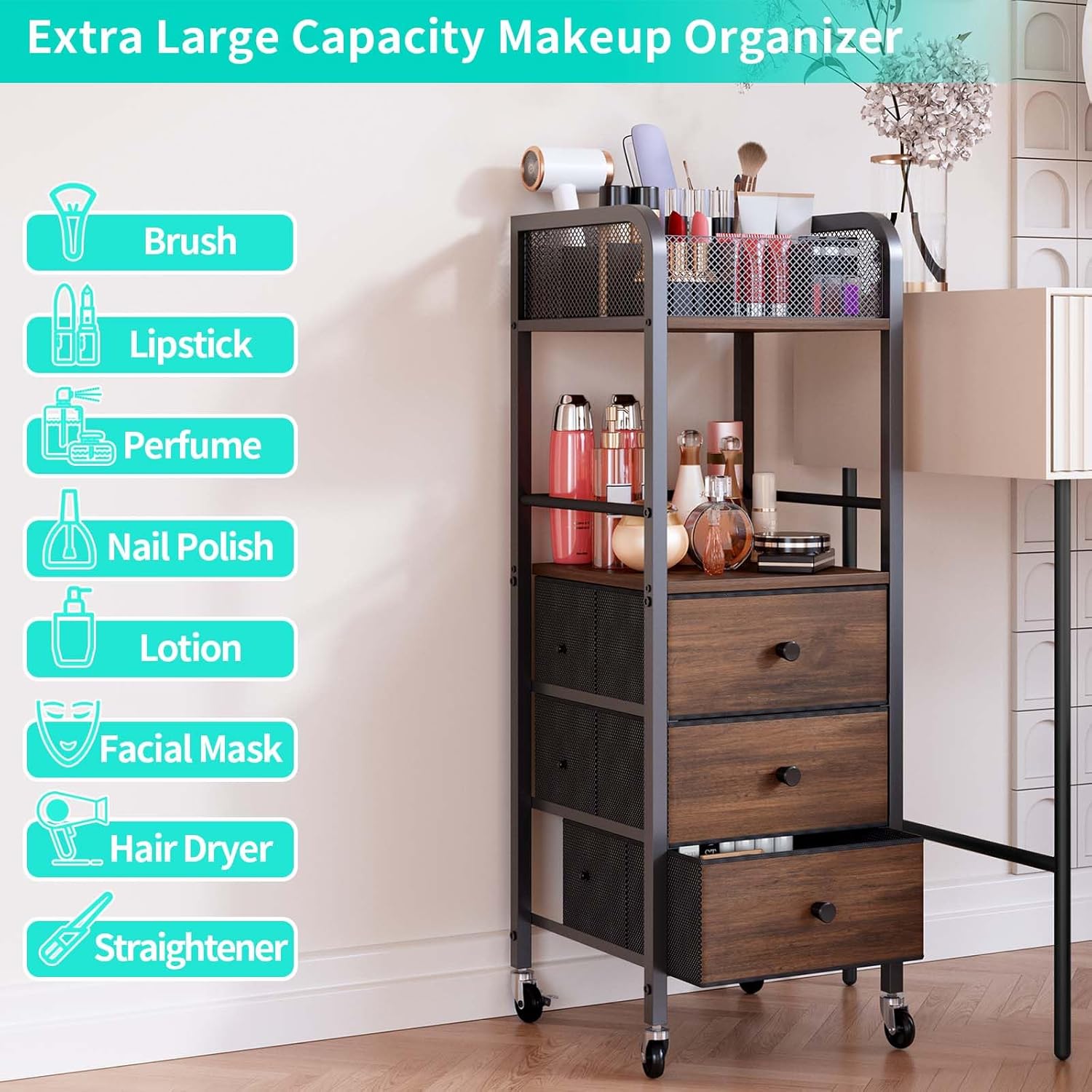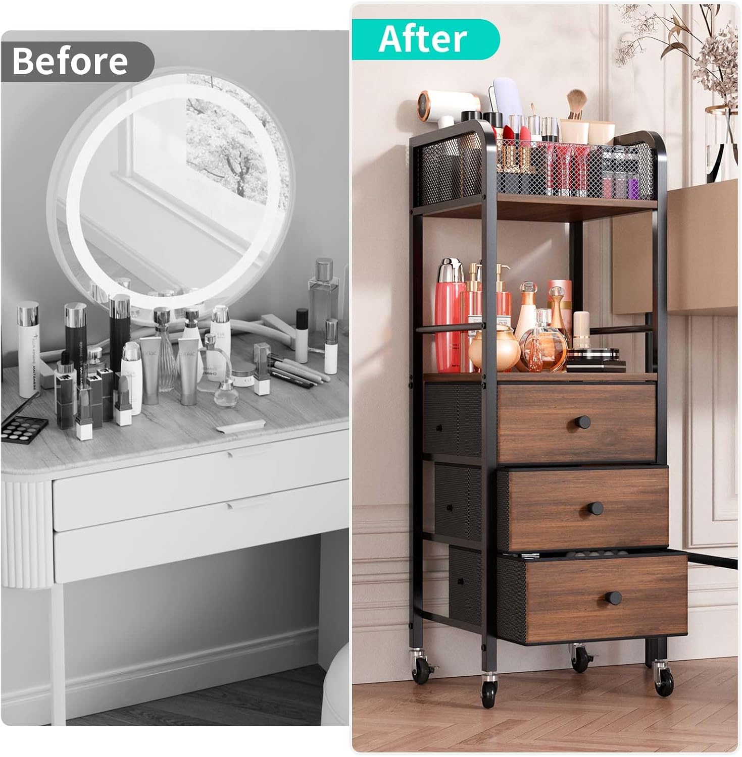 - [360° Swivel Casters]: The cosmetic organizer is equipped with four rolling casters for easy movement and position adjustment. Front casters include built-in brakes to lock the makeup cart in place, adding stability