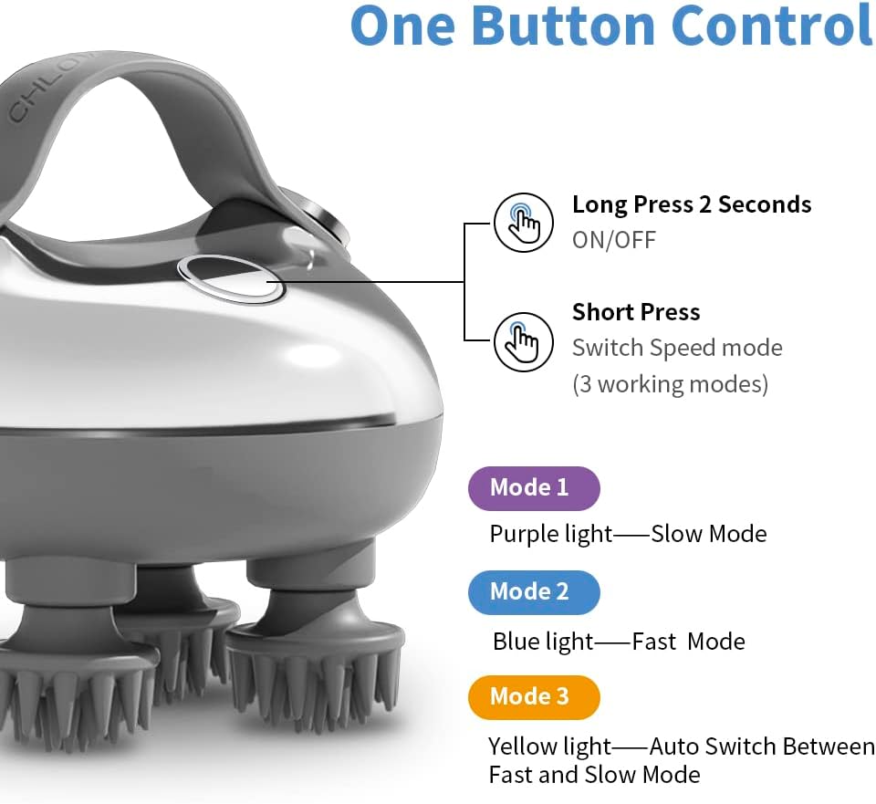 - 【Portable and travel-friendly】: Compact and lightweight, this scalp massager is easy to carry and can be used anytime, anywhere. Simply press the button to start the massaging action for a relaxing experience. Chlovoe Scalp Massager come with multiple massage modes and intensity settings, allowing users to customize their massage experience to their preference. and they can be used by people of all ages and hair types.