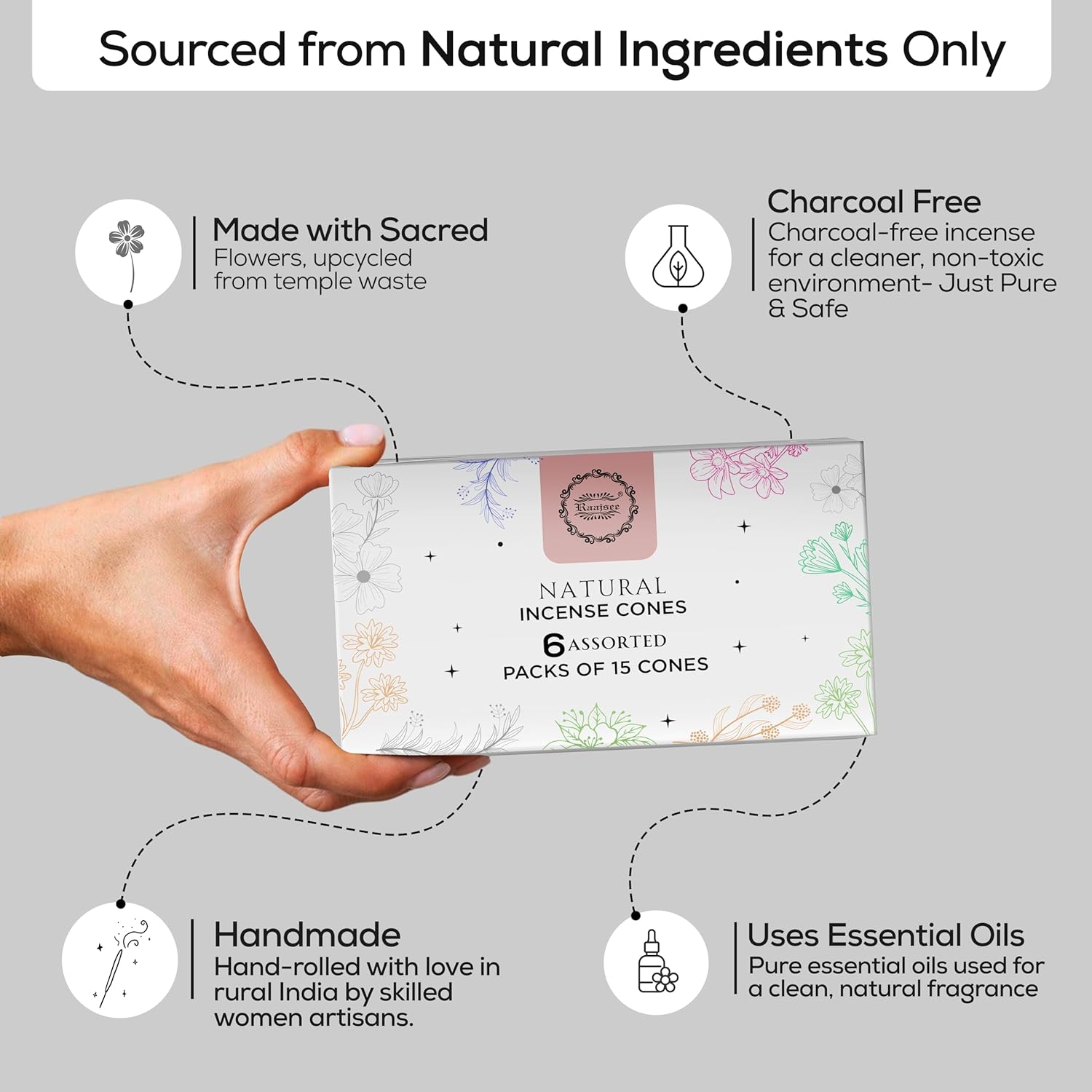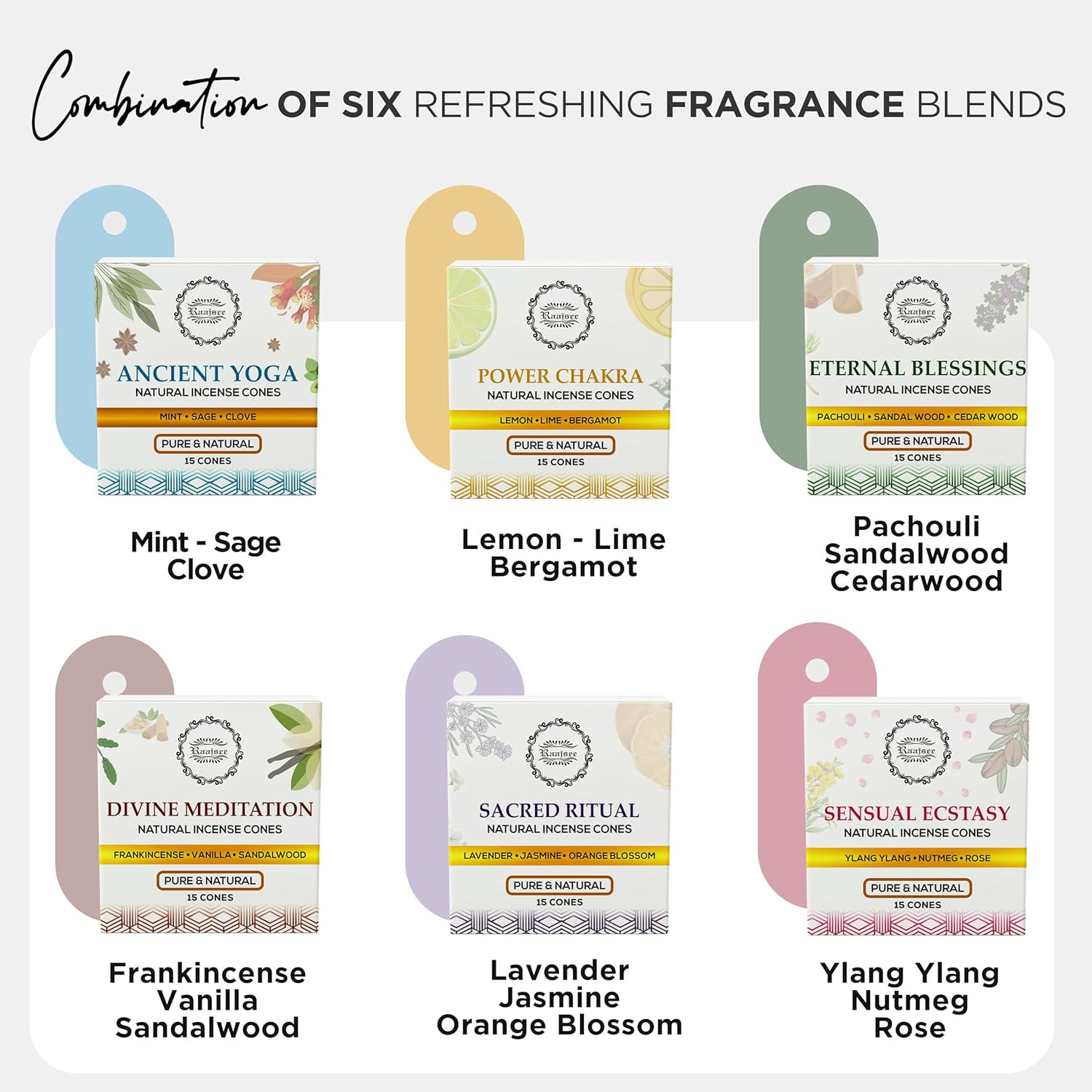 Raajsee Natural Incense Cones,6 Pack Mixed Scents Gift Pack 15 pc Each (90 Total), Insense Cones Variety Pack, 100% Organic Non Toxic Natural - Hand Rolled Free from Chemicals (Pack 3)