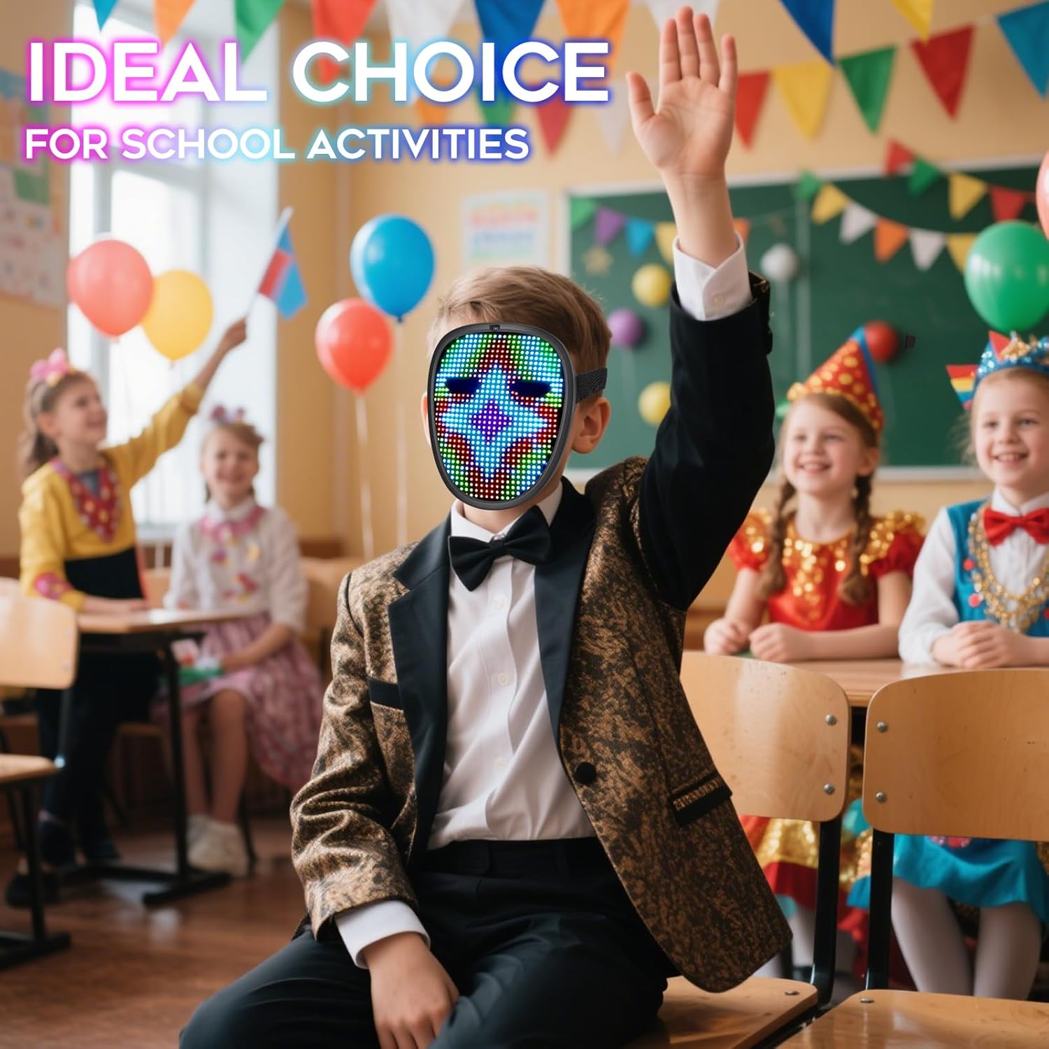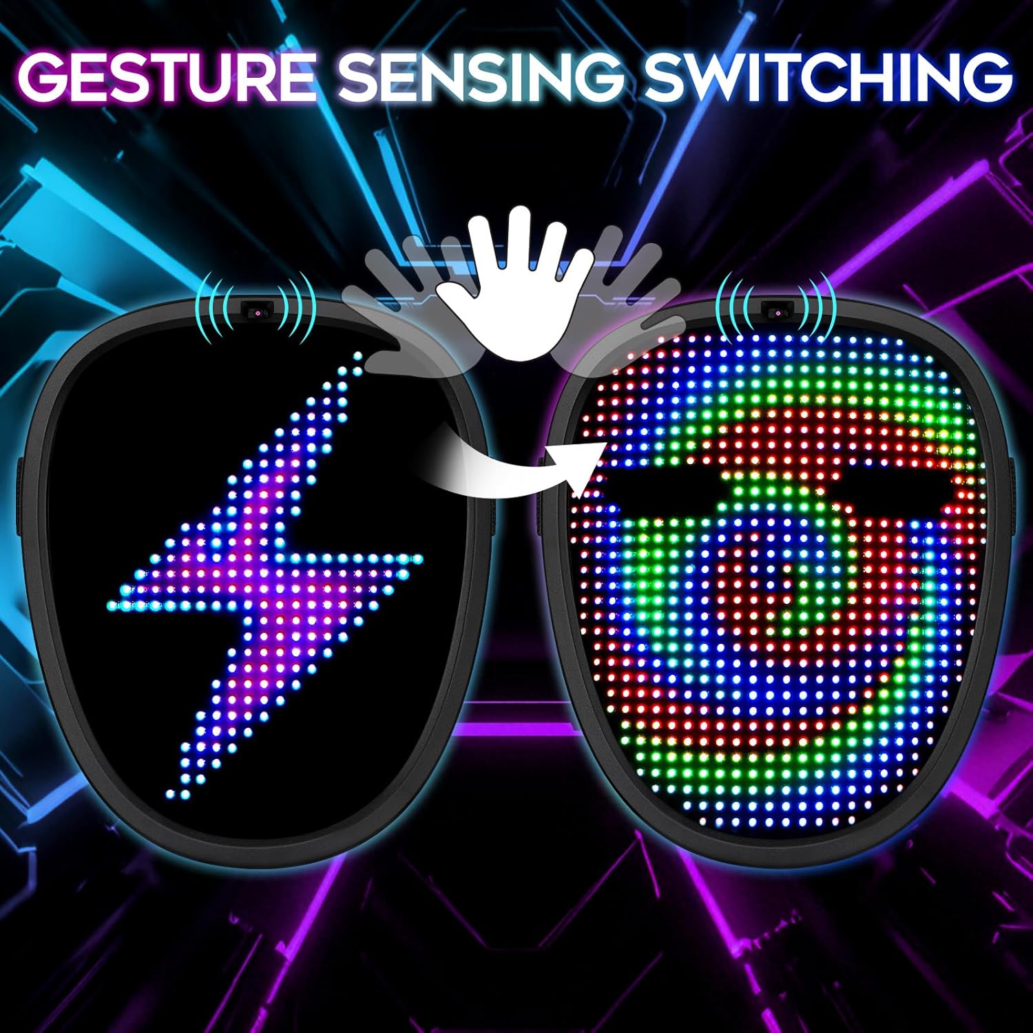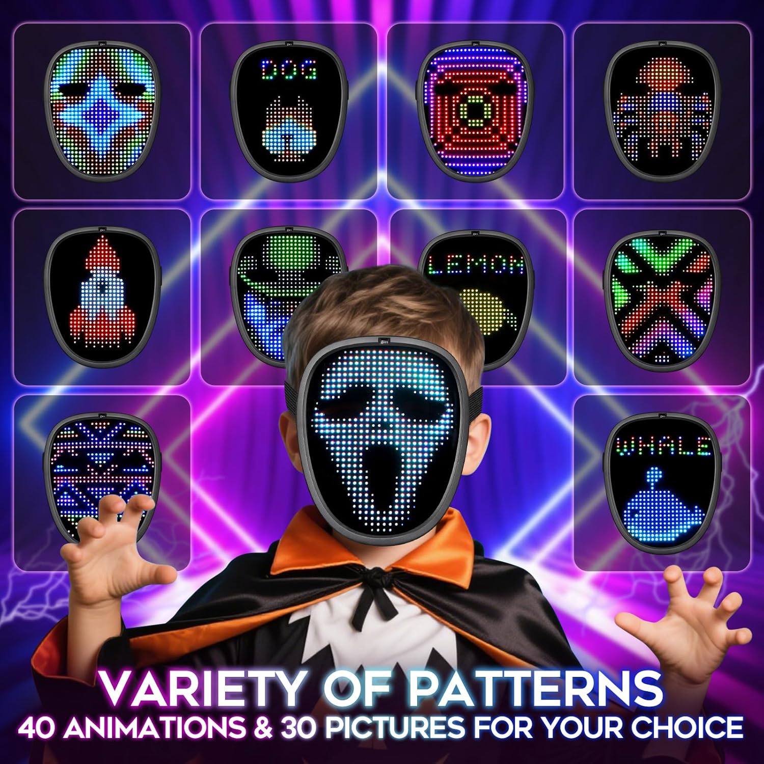 - Awesome Darkness Superstar: Our LED mask for kids features 40 dynamic display modes and 30 static display images, supports gesture sensing and can be changed to different patterns/pictures by simply waving your hand across the mask. Bright and vibrant colors, along with the excellent graphics and animations, the coolest LED Mask is easy to make your kids look distinctive and eyeball-catching in the crowd!