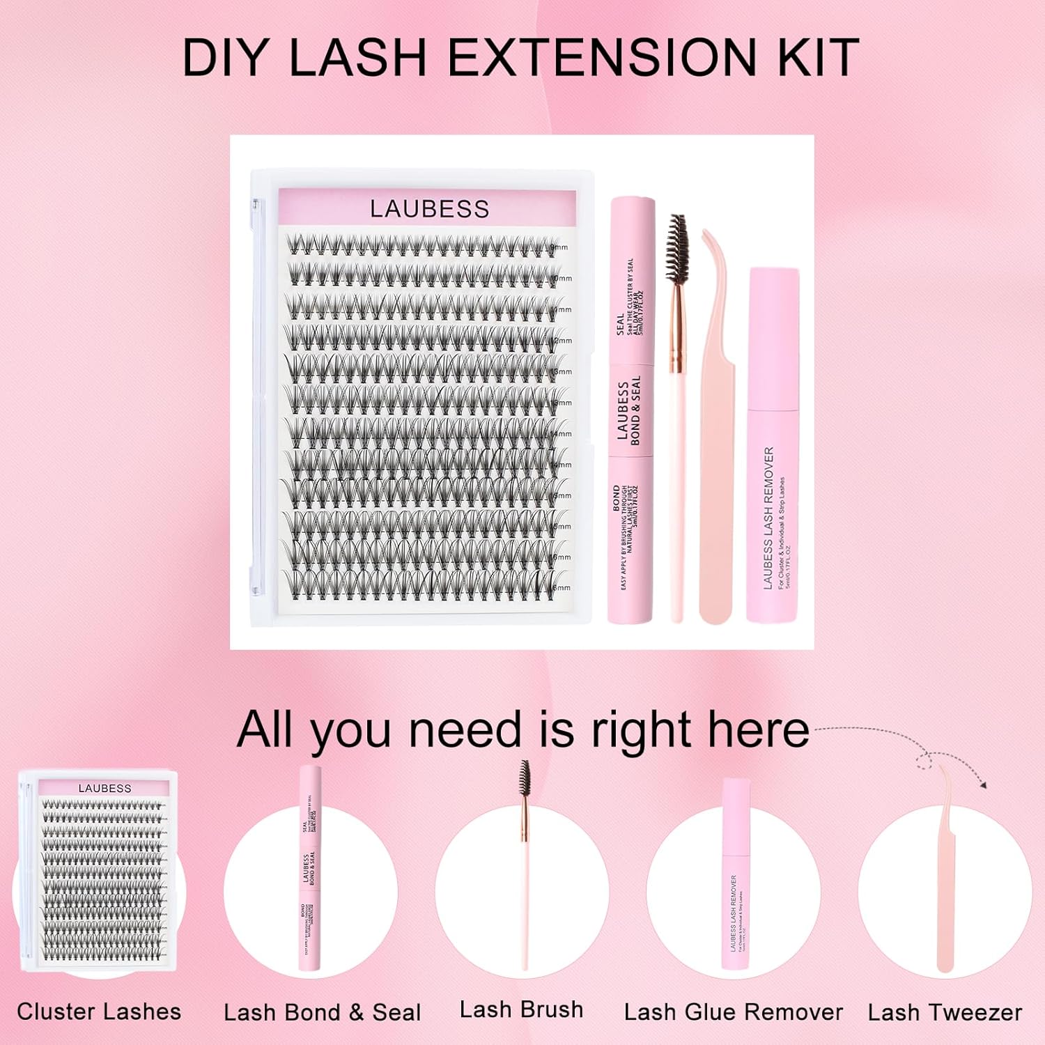 - LAUBESS Lash Clusters Kit: 1 box Lash Clusters, Lash Bond and Seal, Lash Glue Remover, LashTweezers and Brush. Everything you need is right here. You can easily apply individual lashes to diy lash extensions look with less time and money, even if newbies.
