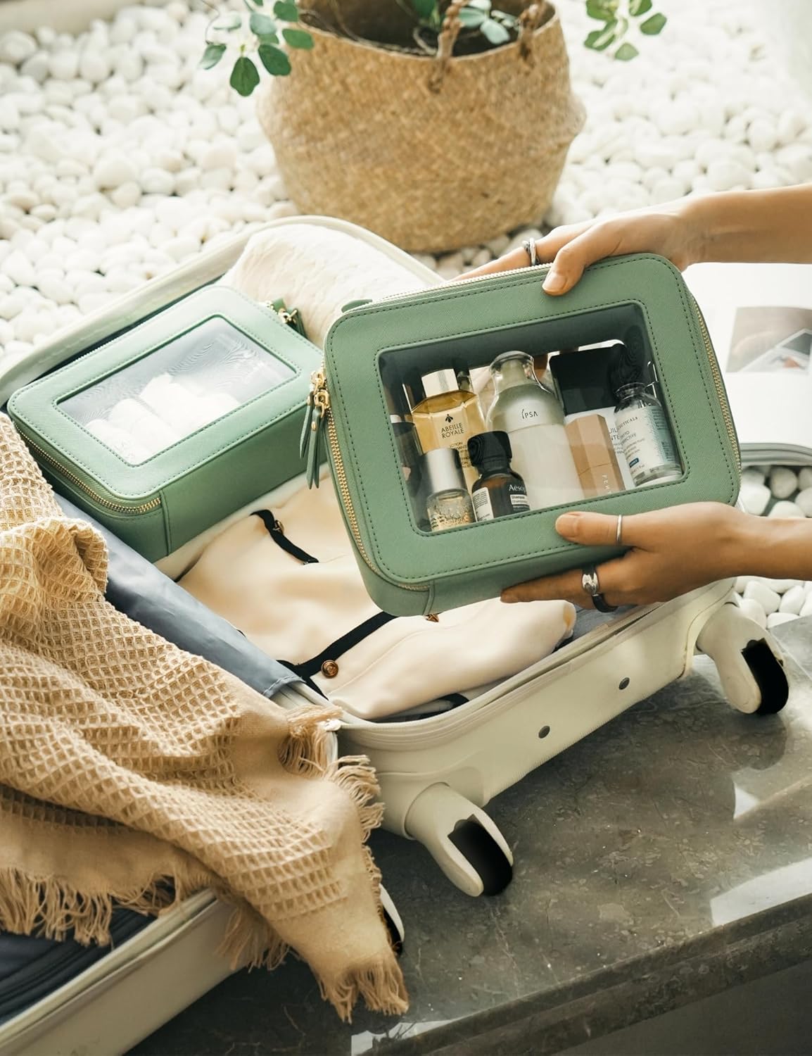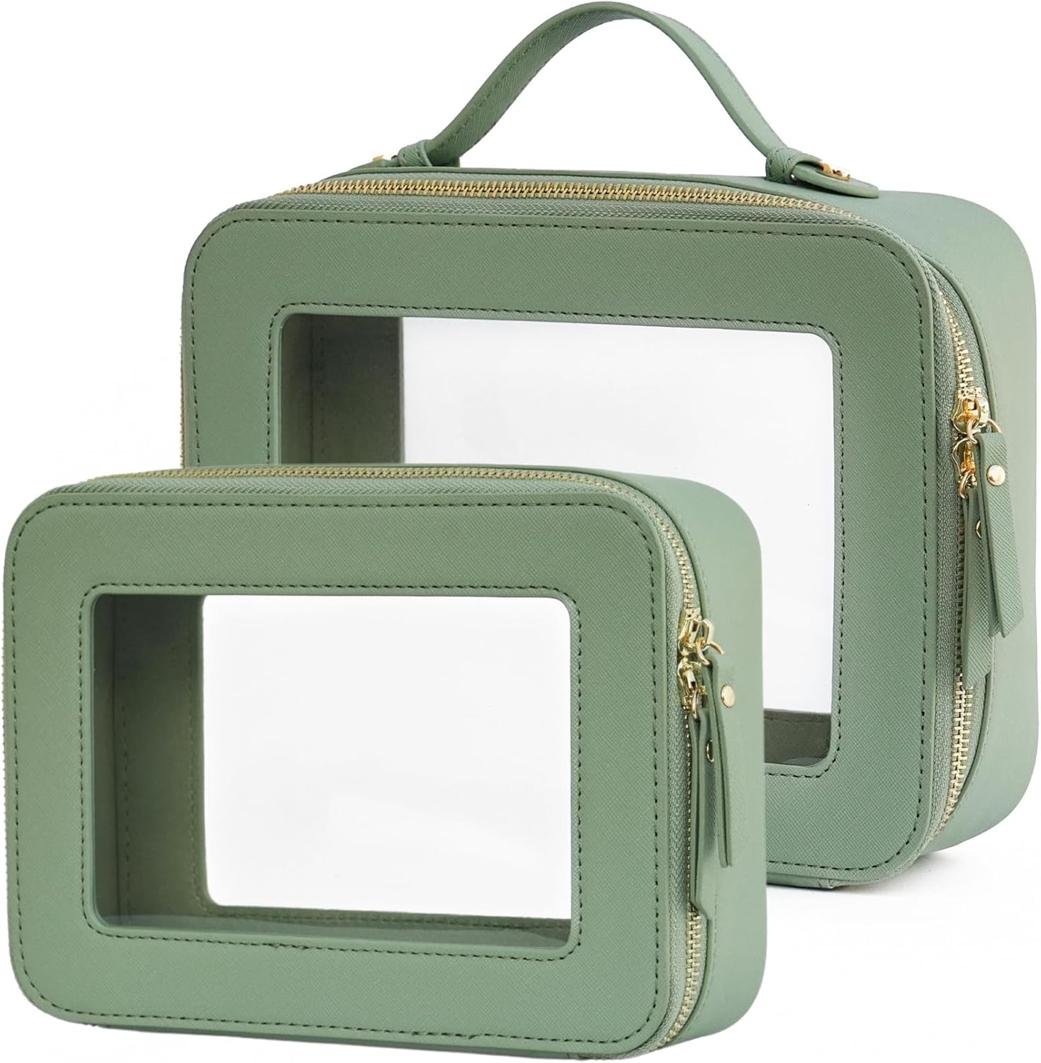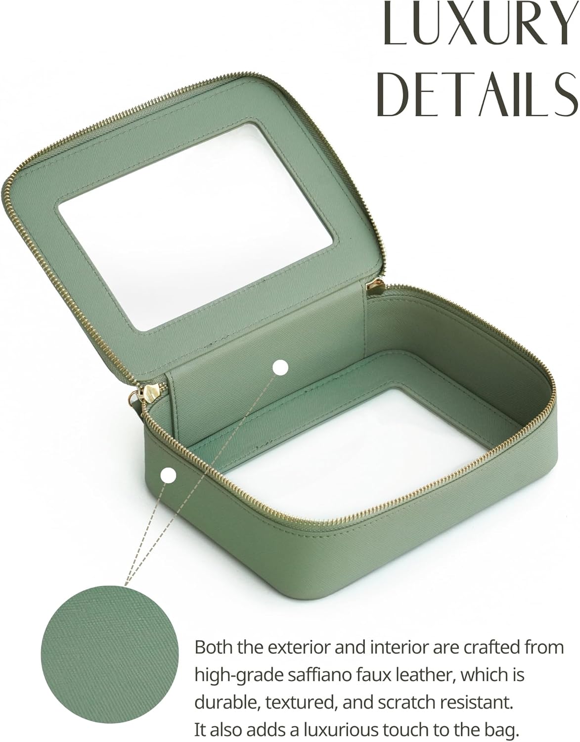- [Premium Material and Durability] – The clear cosmetic case, both the exterior and interior, is crafted from high-grade saffiano faux leather, which is highly scratch resistant, durable and exceptionally easy to keep clean. It features a smooth zipper for secure closure, and elegant light gold metal hardware accents, adding a luxurious and sophisticated touch to the bag's overall design.
