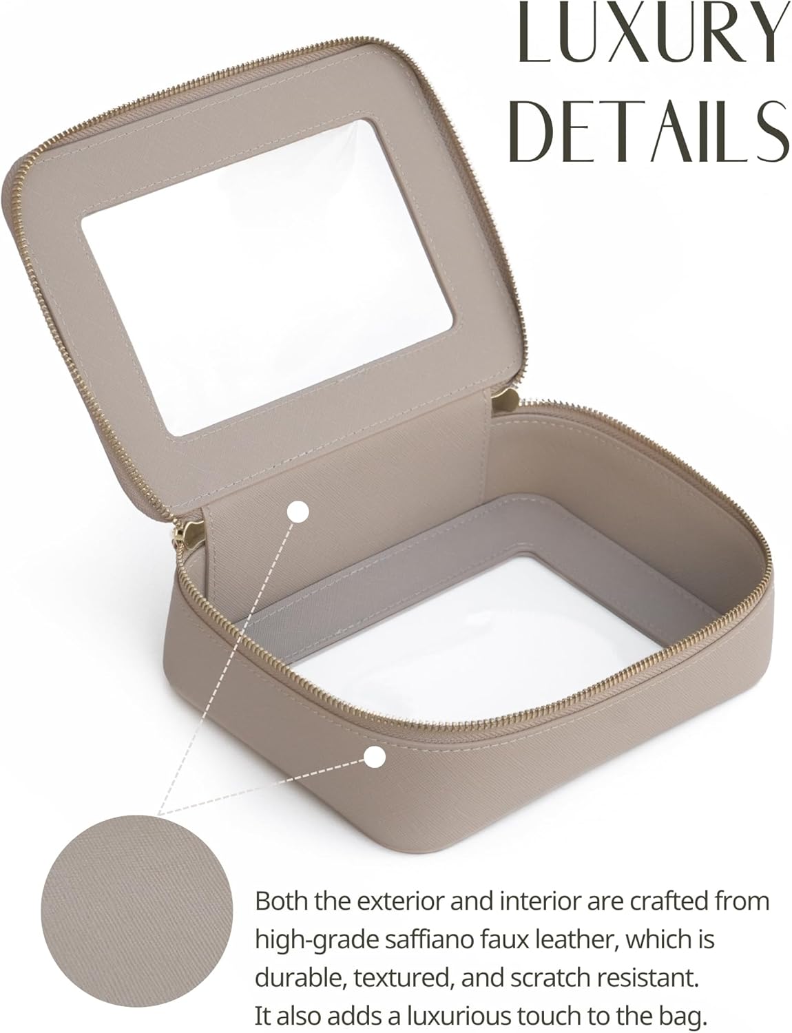 - [Premium Material and Durability] – The clear cosmetic case, both the exterior and interior, is crafted from high-grade saffiano faux leather, which is highly scratch resistant, durable and exceptionally easy to keep clean. It features a smooth zipper for secure closure, and elegant light gold metal hardware accents, adding a luxurious and sophisticated touch to the bag's overall design.