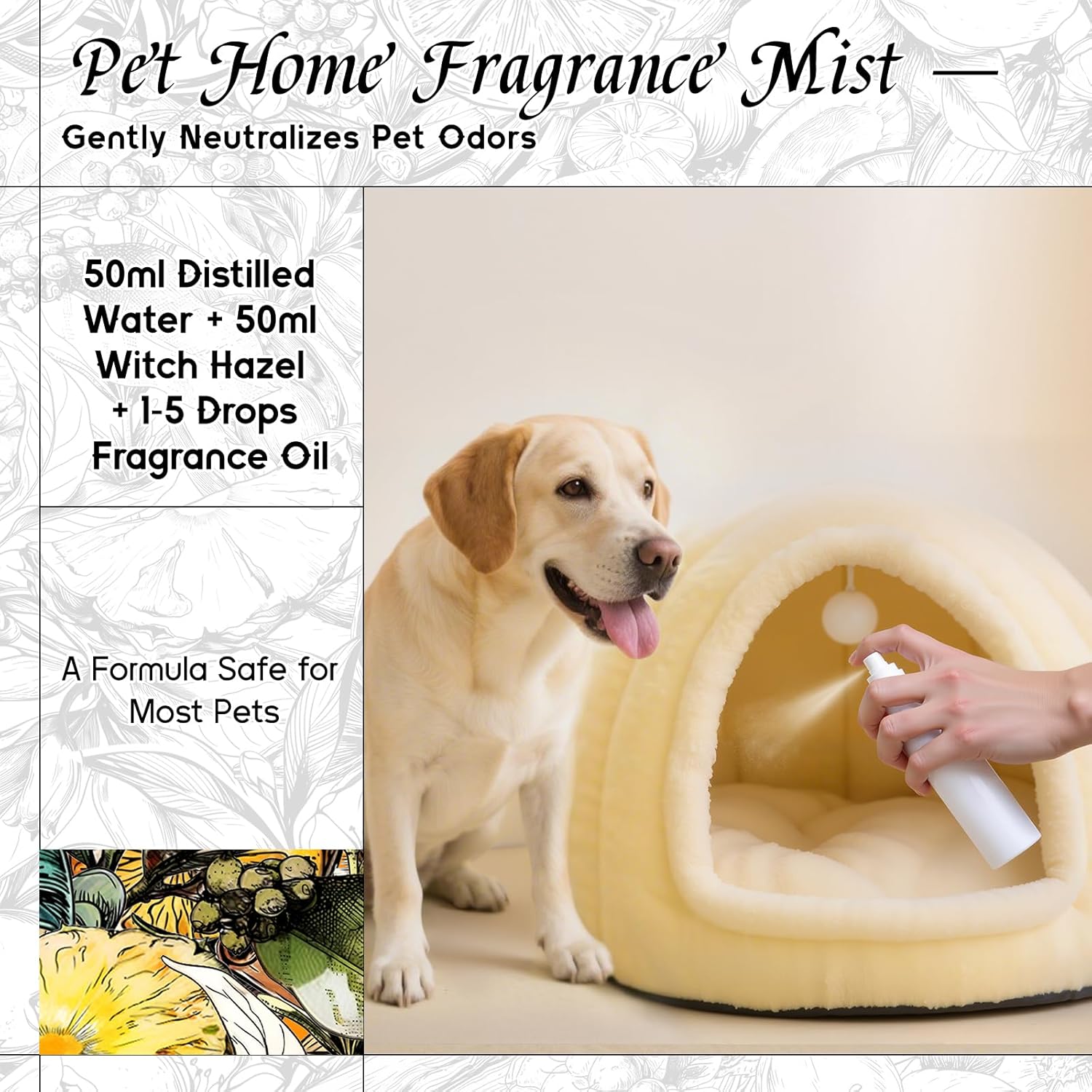 - Pet-Safe Formula – Gentle enough for DIY pet home fragrance mist and DIY pet sprays. Free from harsh ingredients. It neutralizes odors without risking your pet’s health