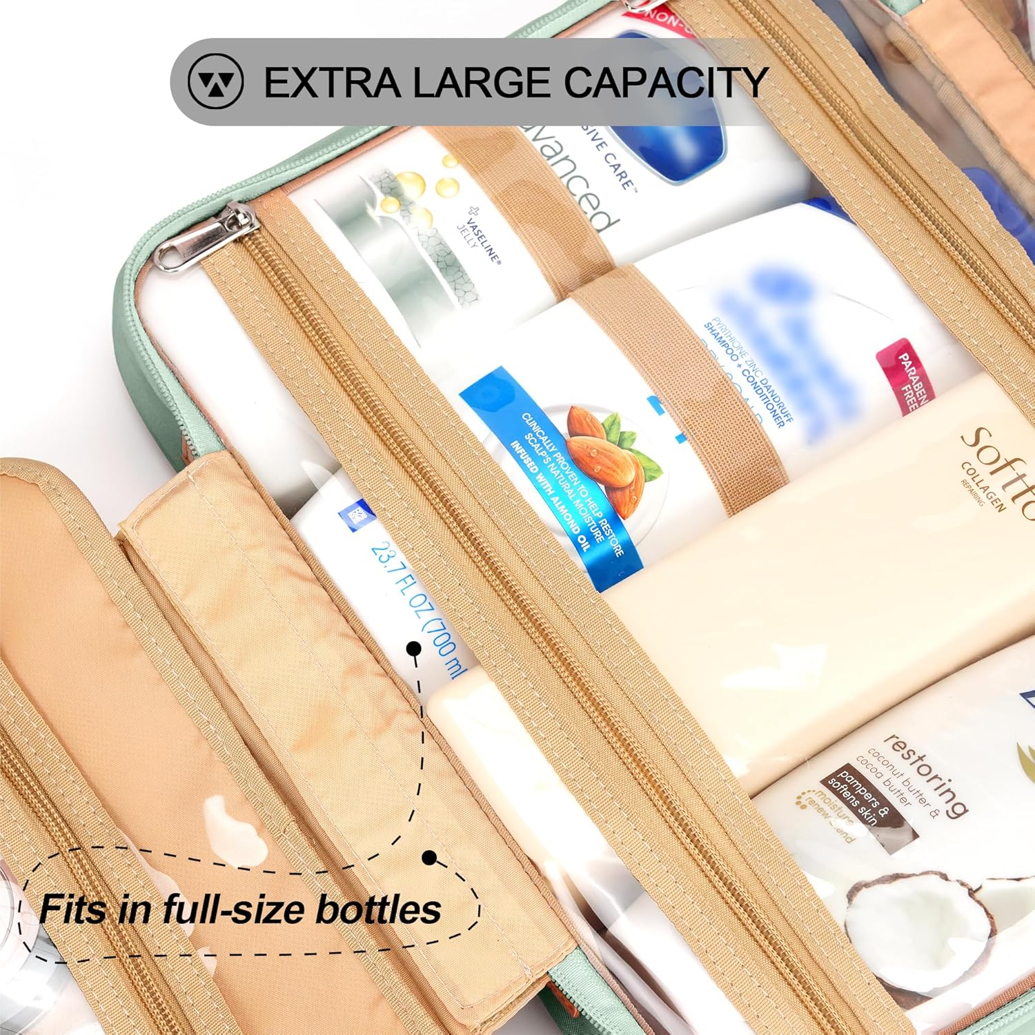 - PATENT PENDING GREAT ORGANIZER MASTER - This wash bag is designed with 4 toiletry storage compartments and a special jewelry compartment; you can easily put your wash products and jewelry separately to make your journey organized. The size of the fully-loaded state is 12.5''L x 10''H x 4.5''W, the 2 main compartments can hold up to 8 full-sized toiletries and cosmetics at the same time, no worries for long-distance travel.
