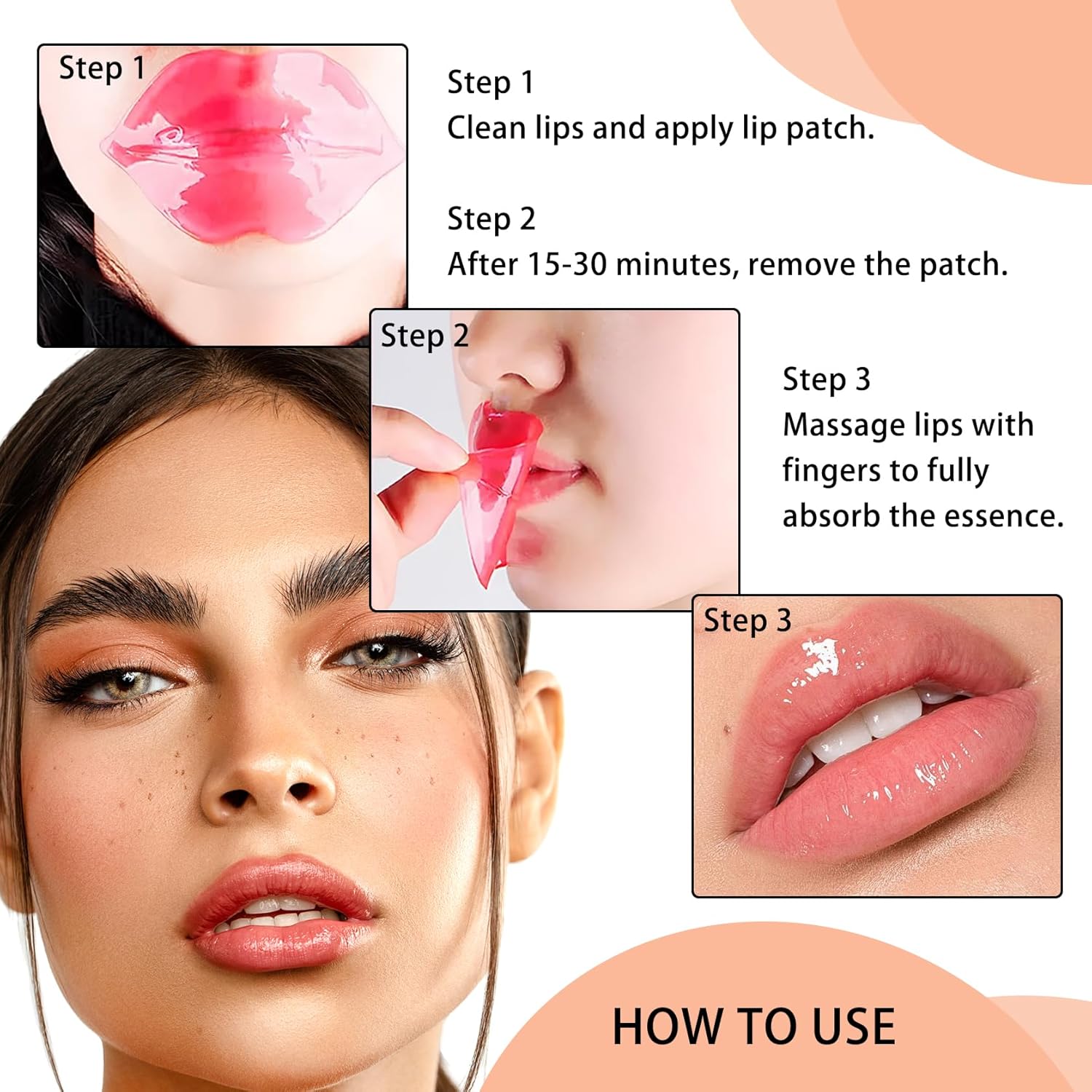 - Easy to Use: Take the lip mask patches out of the individual package, gently unfold them, place the lip patches flatly on the lips, make sure they are in full contact with the lip skin, leave them on for 15-20 minutes, remove the lip mask sheets and finally gently massage the lips until they are absorbed