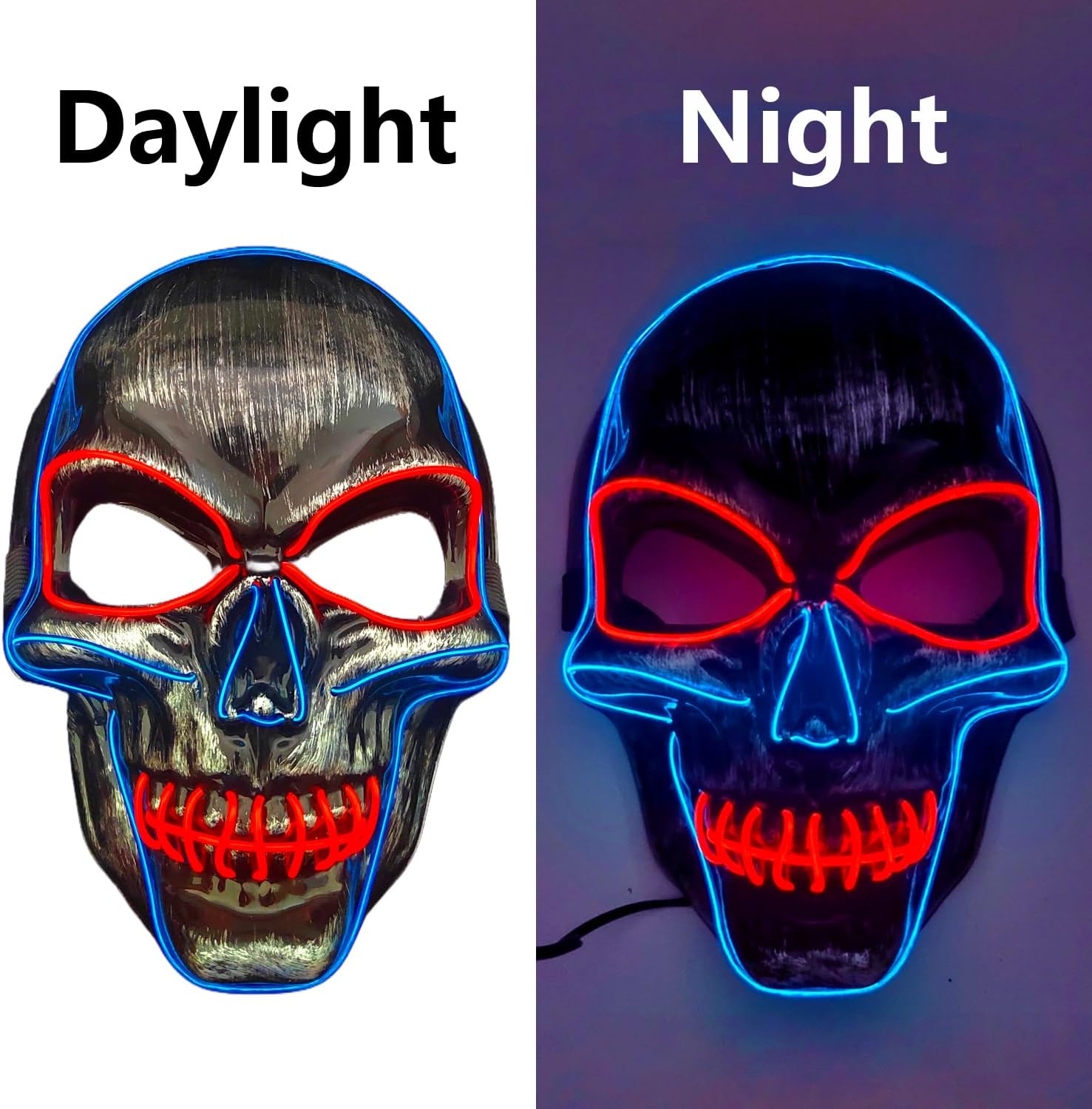 - 【Halloween Any Party Occasions】A scary face and pose will let you get more candy on halloween.EASY TO USE BY TURN ON LIGHT(YOU NEED EXTRA BUY BATTERY,IT NOT INCLUDE)The Mask Can be used on many occasions, such as Party, Rave Parties, Discos, Clubs, Halloween,Birthday, Festivals and other Events.