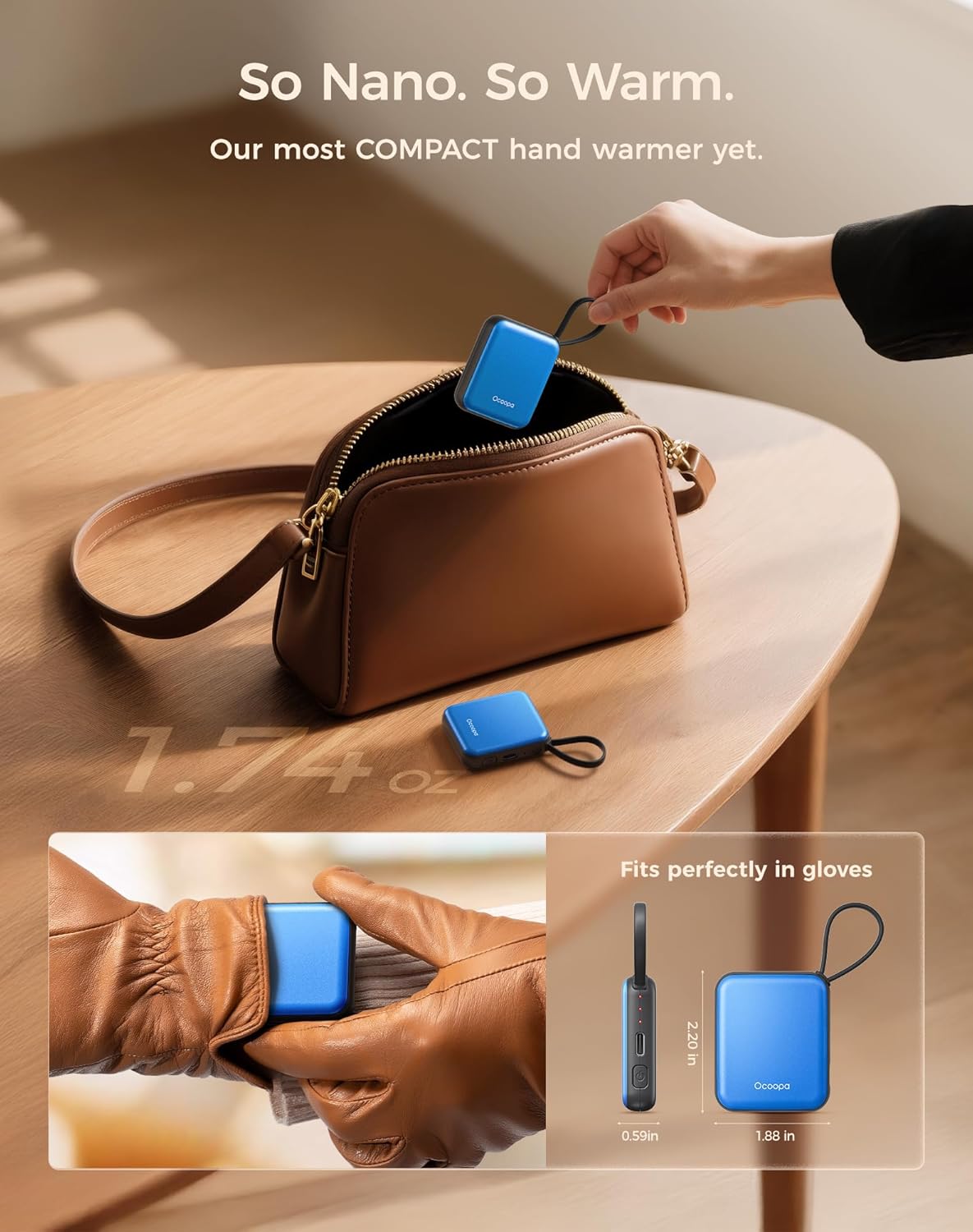 - Ultra-Nano Size – Designed for Her Hands: This ultra-slim rechargeable hand warmer smaller than your palm, lighter than a lipstick. UT5 Nano fits perfectly in gloves, pockets—even wallets. Tailored for women who love warmth without the bulk.